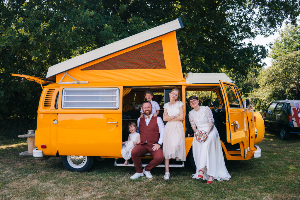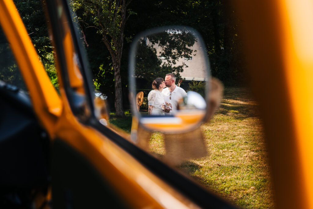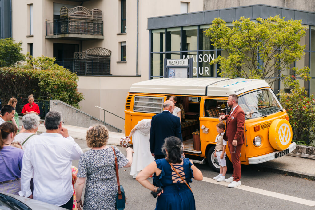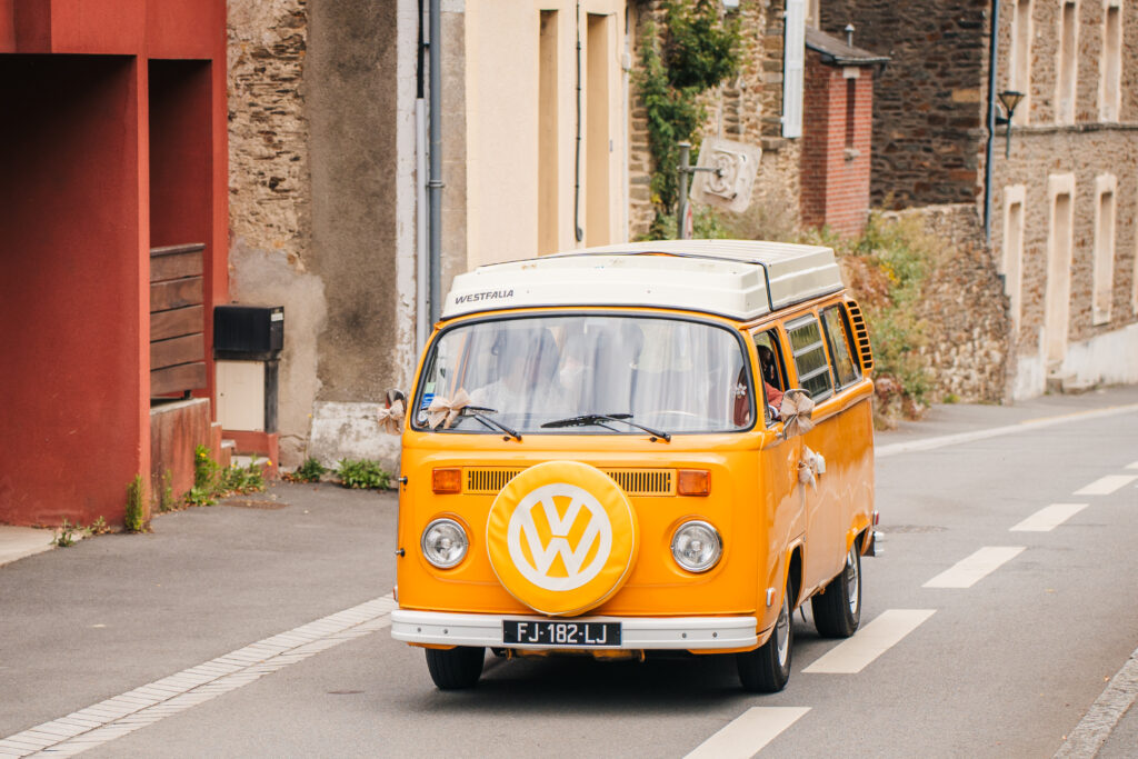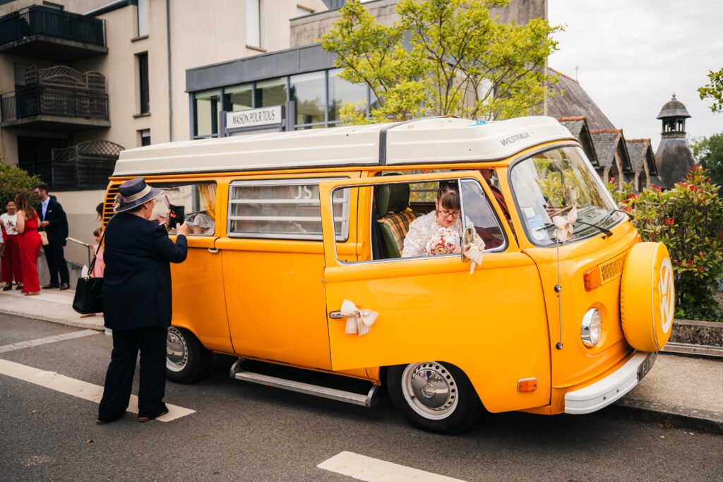 Les festivités ont commencé à Châteaubourg, ma ville de cœur et où je travaille en tant que photographe depuis plus de dix ans. Dimitri et Gwenn avaient prévu un véritable clin d’œil vintage avec la présence d’un combi Volkswagen, parfaitement décoré, qui a accompagné les mariés tout au long de la journée.