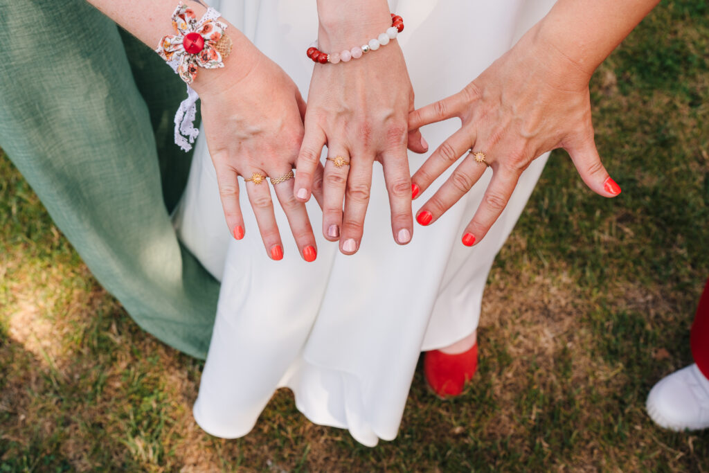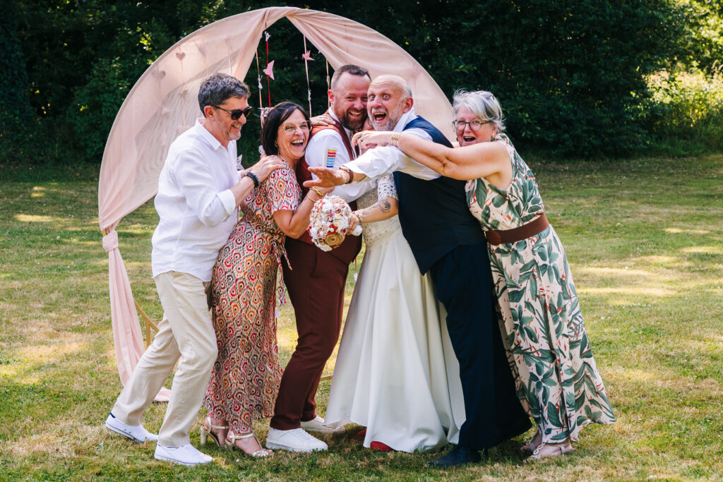 Rires, larmes, embrassades… les émotions étaient au rendez-vous ! Le soleil était lui aussi de la partie (un peu trop peut-être !), mais les invités ont gardé le sourire, bien à l’ombre des arbres ou sous les jolis chapeaux prévus pour l’occasion.